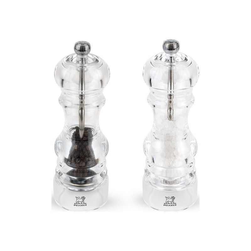 Un duo de moulins poivre et sel de 18 cm transparent en acrylic pour relever tous vos plats en cuisine comme sur la table.