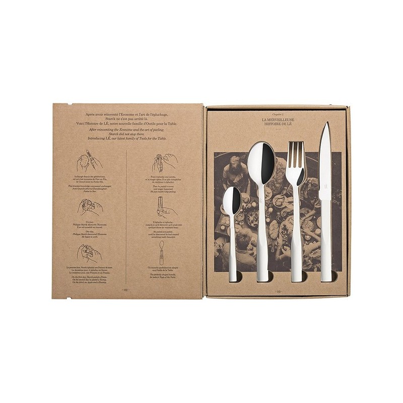 Pour dresser une table jusqu'à 6 personnes, la Maison Degrenne s'associe avec le designer visionnaire Philippe Starck pour cette collection L'E: - 6 couteaux, - 6 fourchettes, - 6 cuillères de table, - 6 cuillières à café, Acier inox 18-10 de haute qualité, manches ABS-SAN. Compatible lave-vaisselle. Coloris: blanc navet.