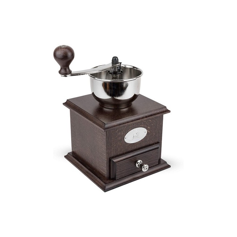 Fonctionne en manuel avec une manivelle traditionnelle et un tiroir récupérateur du café fraichement moulu.