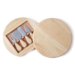 En bois d'hévéa. Plateau pivotant. 1 couteau à beurre et pâte molle, 1 couteau à pâte cuite, 1 pelle-lame à parmesan, 1 fourchette à fromage.