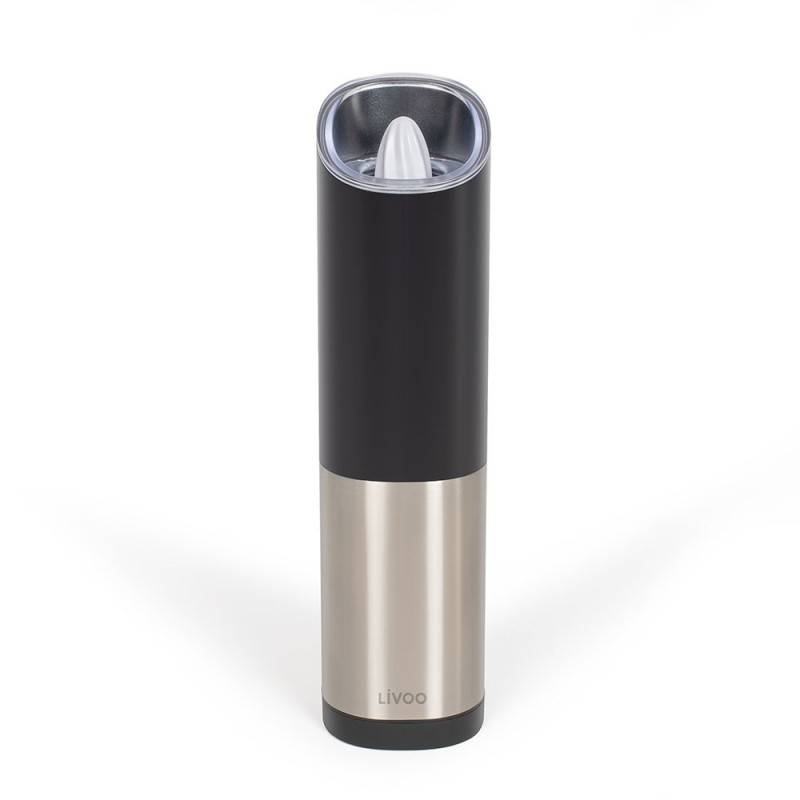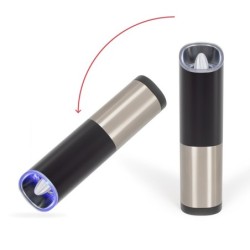 Déclenchement par capteur de gravité. Grande capacité 80 ml. Mouture réglable. LED bleue de fonctionnement. Compartiment à épices transparent. Corps en acier inoxydable. Convient pour le sel, le poivre et toute autres épices en grains. Batterie Ni-mh. Câble de type USBC inclus.