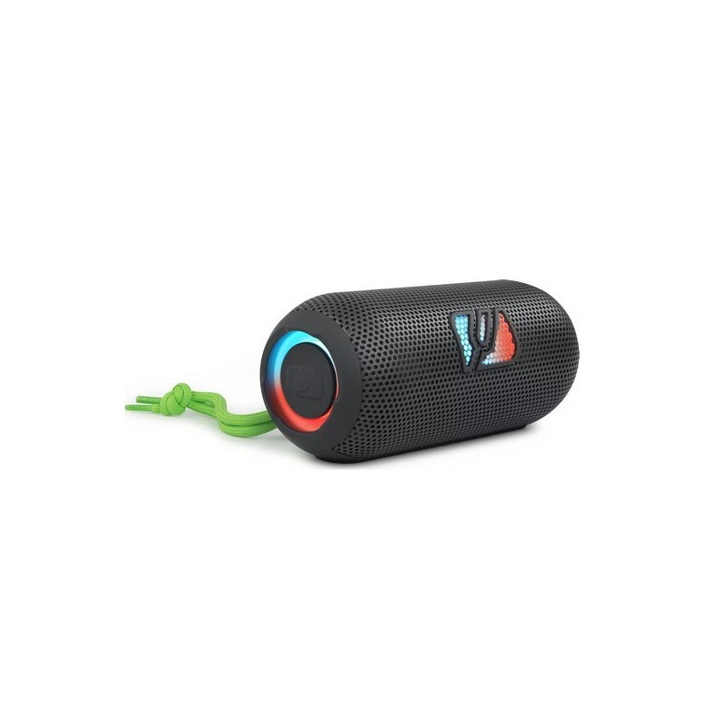 Puissance de sortie 60 Watts. NFC : Fonction de couplage automatique. Couplage Stéréo. Portée 10 m . Effets lumineux. Voyant LED d’appairage du Bluetooth. Autonomie: jusqu’à 10 heures. Conception IPX4 : résistance aux projections d’eau. Batterie lithium intégrée 2400 mAH / 7.4 V. Avec un câble USB-C. Avec deux dragonnes de transport. Dimensions: 178 x 77 x 77 mm.