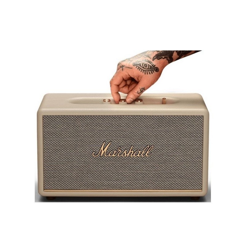 Enceinte au style vintage avec une grille crème et boutons en métal.