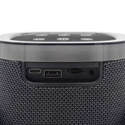 Puissance haut-parleur 5W . Batterie li-ion rechargeable 1500 mAh . Autonomie en écoute?jusqu’à 4h . Temps de recharge :?2.5h . Micro intégré pour répondre aux appels téléphoniques en mains libres. IPx6 : protection contre la pénétration de jets d’eau à forte pression . Finition en tissue et silicone . Lumière LED à couleurs changeantes . Bluetooth 5.3? . Port USB, Aux & port TF . Portée 10 m . Câbles de chargement USB A vers USB-C 30 cm inclus .