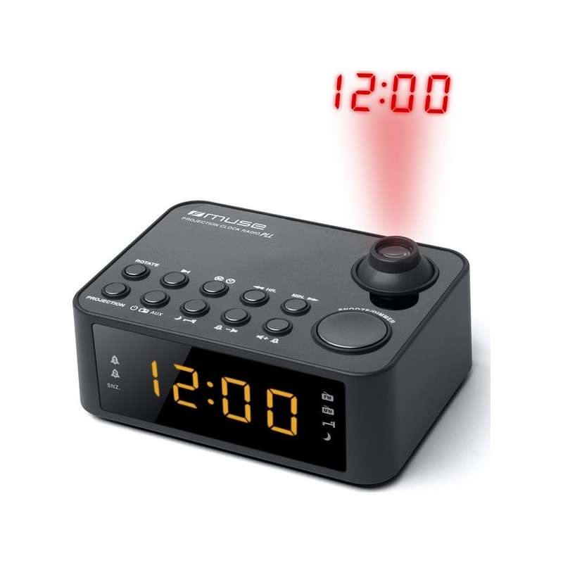 Projection de l'heure avec bouton Marche/Arrêt, angle réglable et rotation d'image. Radio PLL FM/MW avec stations préréglées. Horloge 24 heures. Réveil par radio ou buzzer. Fonctions répétition d'alarme, sommeil et sieste. Entrée auxiliaire (pour lecteur MP3). Dimension: 58mm (H) x 110mm (P) x 149mm (L).
