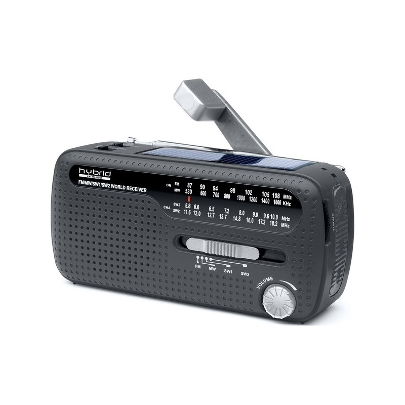 FM avec alimentation hybride: par dynamo à manivelle, énergie solaire par un panneau (5V) et piles 1,5V. Sirène de secours et lumière d'alerte clignotante. Lampe torche à 3 LED de forte luminosité. Prise pour la recharge d'un téléphone portable ou lecteur MP3 et écouteurs. Connecteur USB standard, prise alimentation extérieure (Mini USB). Dimensions: 62 x 47 x 133 mm.