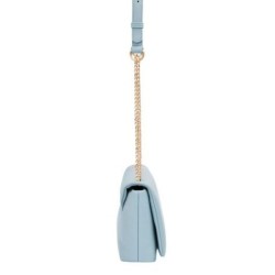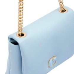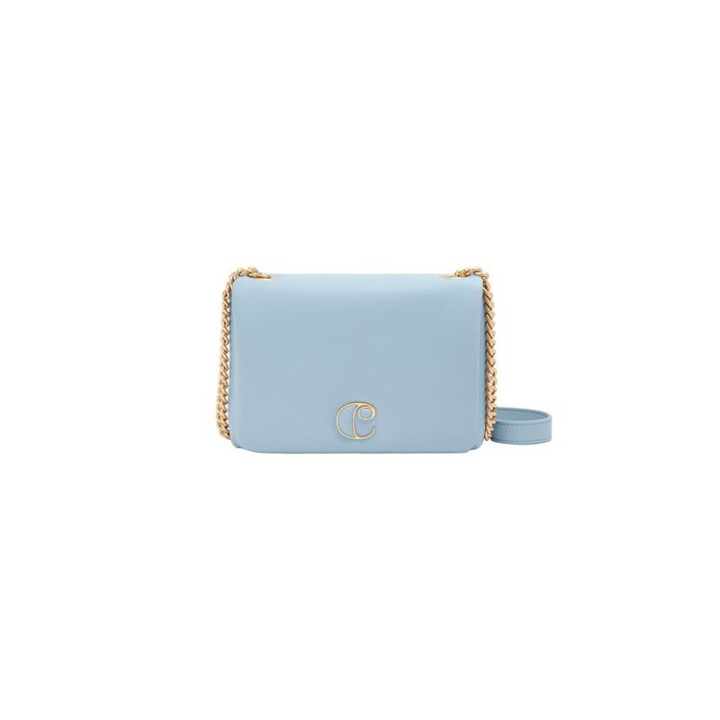 Type : Sac bandoulière compact. Matière principale : Polyuréthane (cuir végétal mat). Finition : Effet matelassé, toucher doux. Couleur : Bleu pastel (Pastel Blue). Finitions dorées raffinées. Plaque logo “C” dorée avec finition ABS bleu clair. Bandoulière ajustable composée de PU et de chaîne en métal. Dimensions : 190 x 60 x 130 mm.