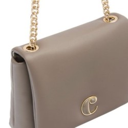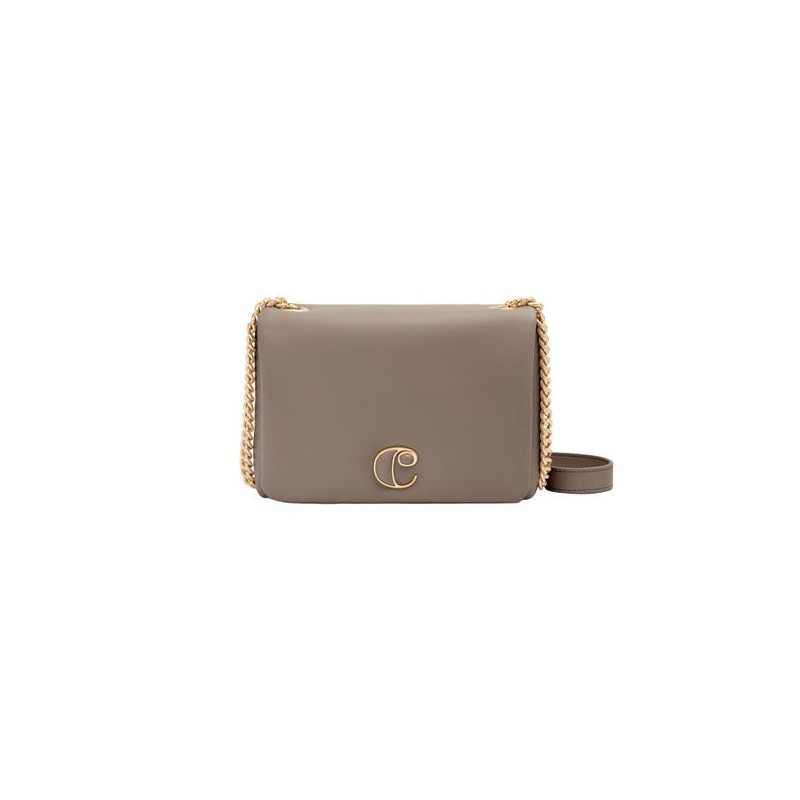Type : Sac bandoulière compact. Matière principale : Polyuréthane (cuir végétal mat). Finition : Effet matelassé, toucher doux. Couleur : Taupe (désignée ici comme Medium Grey). Finitions dorées élégantes. Plaque logo “C” dorée avec finition ABS taupe. Bandoulière mixte : chaîne en métal et sangle en PU, réglable. Dimensions : 190 x 60 x 130 mm.