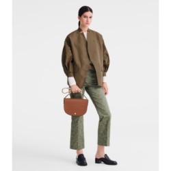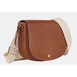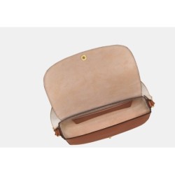 Matière extérieure : cuir de veau lisse. Doublure : refente de cuir de vachette velours. Fermeture : bouton-pression. Accessoires métalliques : couleur doré très pâle. Bandoulière : réglable (hauteur environ 34 – 60 cm), en coton avec empiècements cuir. Poche intérieure : 1 poche plaquée. Dimensions : 25 × 19 × 6 cm.