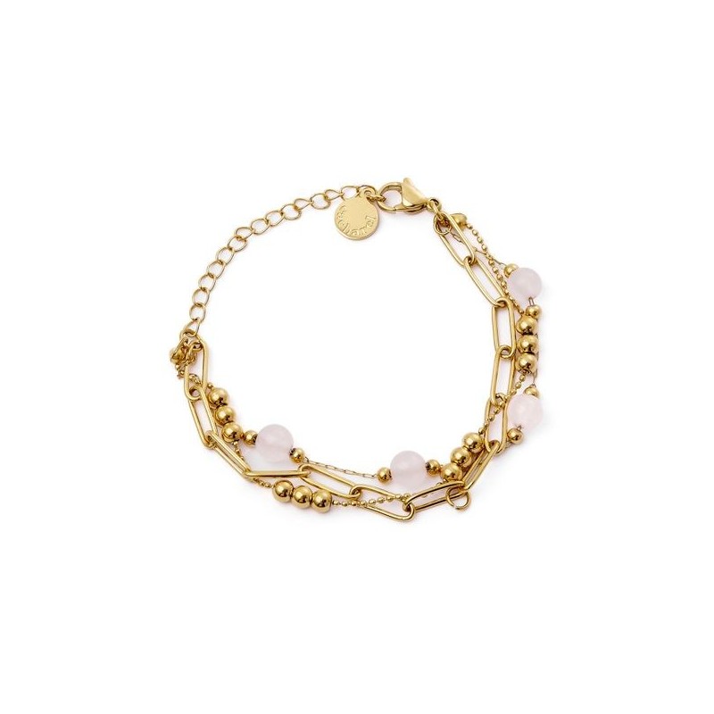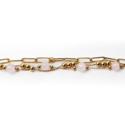Matière : Acier inoxydable Pierres : Quartz rose. Dimension : 200 mm (longueur). Design : Effet trompe-l'œil de plusieurs chaînes et bracelets superposés.