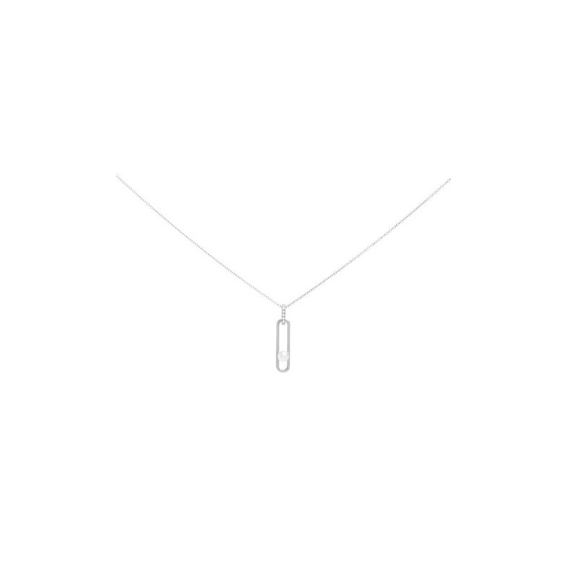 Matière : Acier inoxydable argenté, cristal, perle de verre blanche. Dimension : 480 mm (longueur). Perle de verre blanche nacrée. Détail en cristal incrusté sur un maillon. Pendentif de forme ovale. Finition : Argentée.