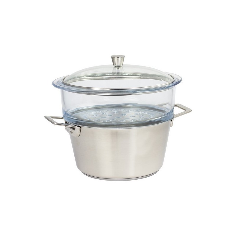 L'ensemble vapeur est composé d'un faitout en inox 1826 avec son couvercle en verre assorti et d'un cuit-vapeur en verre.