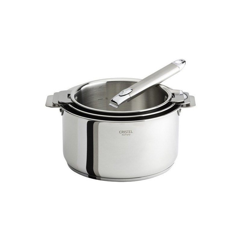 Set de 3 casseroles en inox (diamètre 16, 18 et 20 cm) finition brillant miroir en Multiply trilaminé, à poignée amovible de la collection Casteline Amovible.
