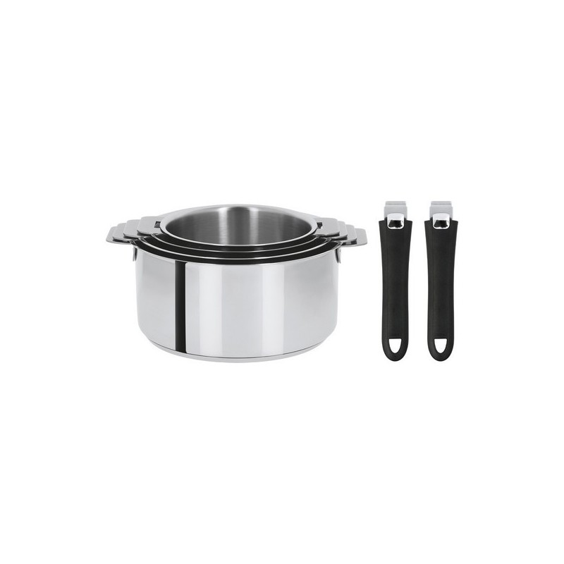 Ce Set de 4 casseroles inox Mutine Amovible (diamètre 14, 16, 18 et 20 cm), à la finition brillante, est un indispensable pour votre batterie de cuisine.