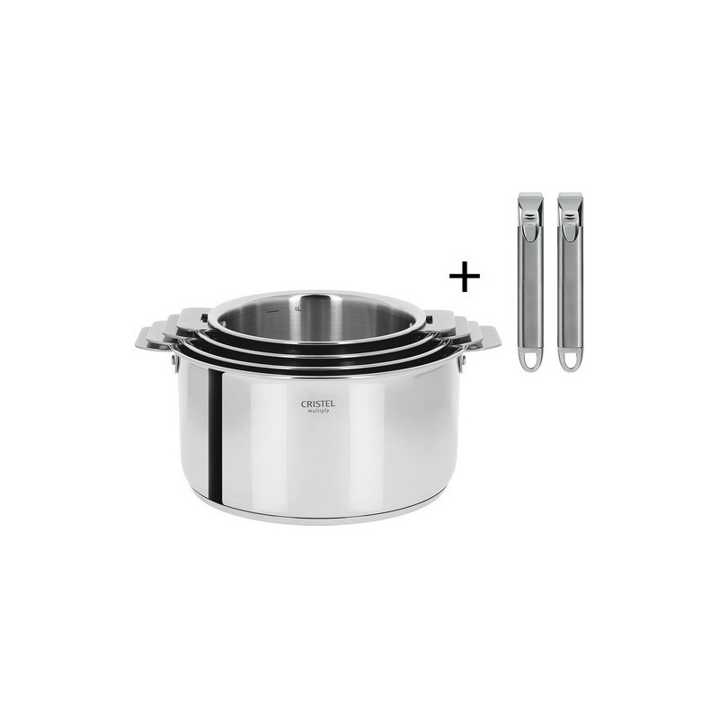 Set de 4 casseroles en inox (diamètre 14, 16, 18 et 20 cm) finition brillant miroir en Multiply trilaminé, à poignée amovible de la collection Casteline Amovible.