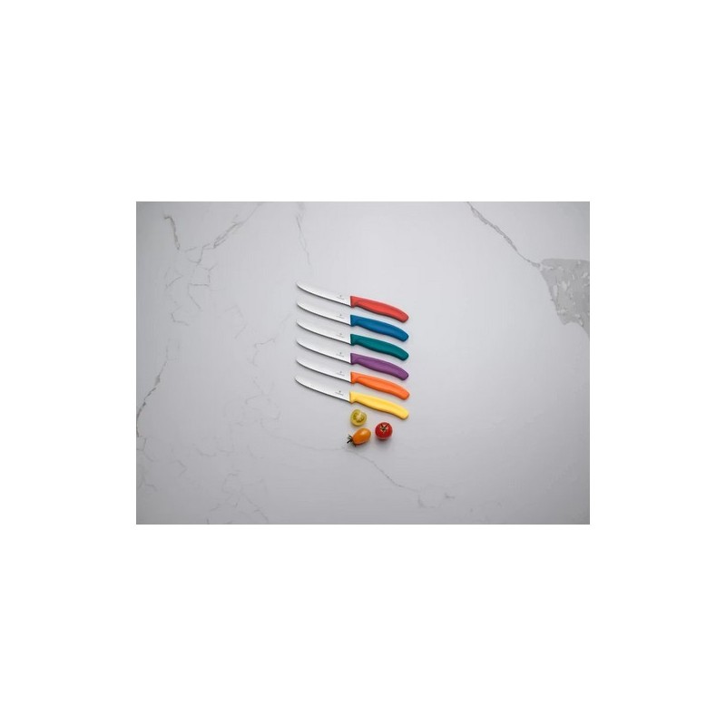 Boîte de 6 couteaux de table, tomates lame crantée 11 cm inox, bout rond, manche polypropylène assortis (violet, rouge, bleu, vert, jaune et orange).