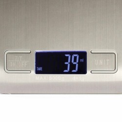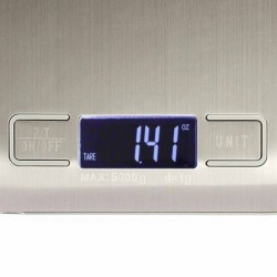 Plateau en acier inoxydable. Ecran LCD rétroéclairé. Fonction Tare. Indicateur de surcharge / de batterie faible. Capacité 5 kg, précision au gramme. Choix de l’unité de mesure. Mise en veille automatique. Vendu sans pile.