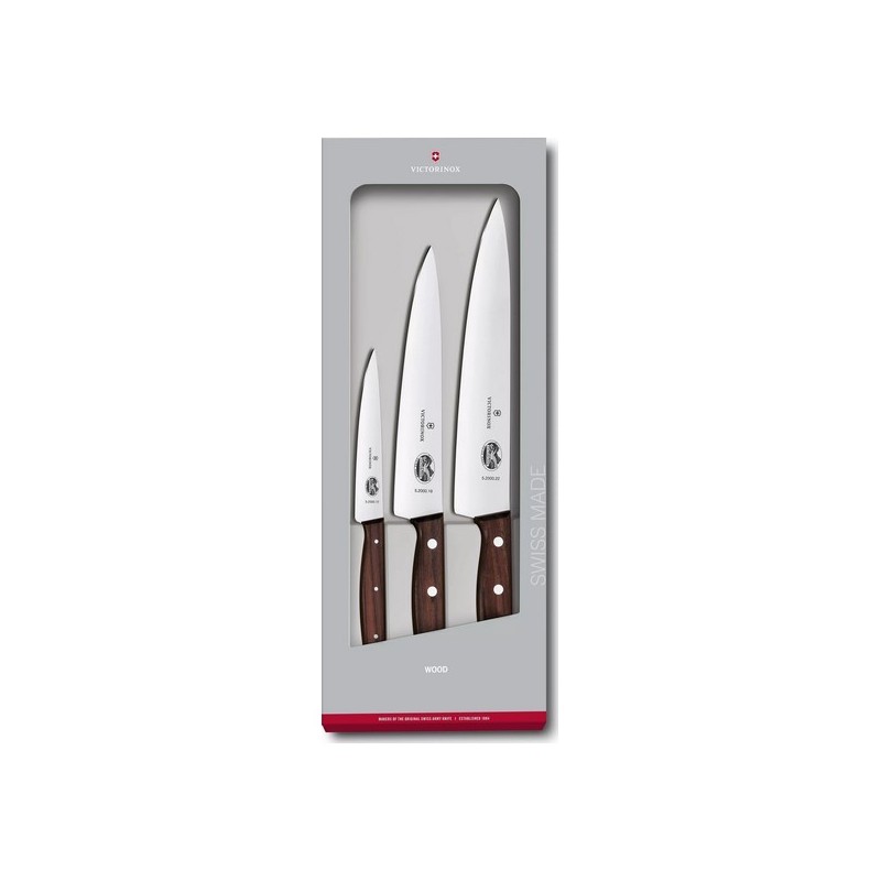 Coffret à découper, 3 couteaux, manche érable modifié, comprenant : 1 couteau éminceur/cuisine 12 cm. 1 couteau à découper 19 cm. 1 couteau à découper 22 cm.