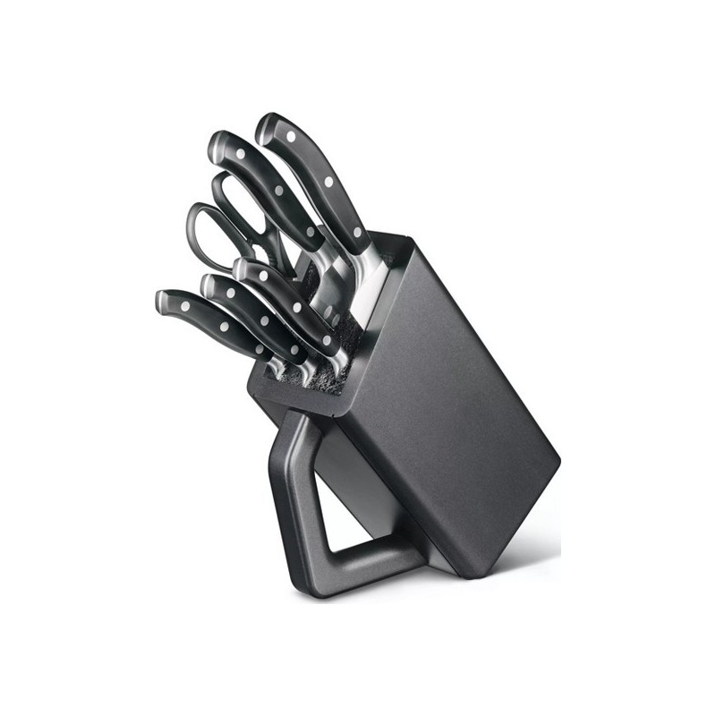 Bloc de 6 couteaux forgés. Bloc de cuisine universel noir (intérieur lanières nylon), 6 pièces inox (dont 5 couteaux forgés) : - 1 couteau chef 20 cm. - 1 couteau Santoku alvéolé 17 cm. - 1 couteau à découper 15 cm. - 1 couteau à steak 12 cm. - 1 couteau office 8 cm. - 1 paire de ciseaux de cuisine.