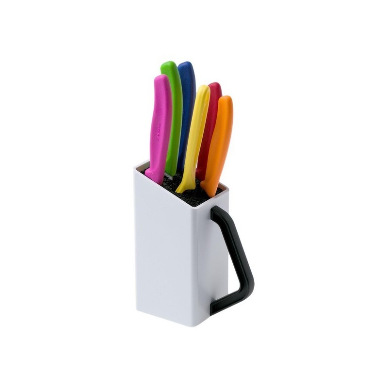 Bloc porte-couteaux Utility avec couteaux de couleurs le bloc porte-couteaux Utility est un authentique Swiss Classic. Contient Victorinox couteau à légumes, 8 cm, orange. - Couteau à légumes, 10 cm, rose. - Couteau à légumes dentelé, 8 cm, rouge. - Couteau à tomates dentelé, 11 cm, bleu. - Couteau à steak, 12 cm, vert. - Eplucheur universel, jaune. - Bloc à couteaux, blanc.