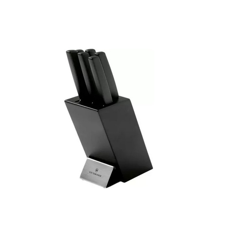 Bloc porte-couteaux compact avec 6 pièces en inox. Bloc de cuisine universel noir (intérieur lanières nylon) Swiss Modern, 6 pièces, manche polypropylène noir, comprenant : - 1 couteau chef, lame 15. - 1 couteau chef, lame extra large 20. - 1 couteau chef, lame 22 cm. - 1 couteau Santoku, lame alvéolé 17 cm inox - 1 couteau à pain/pâtisserie, lame 22 cm. - 1 fourchette découper, lame 15 cm.