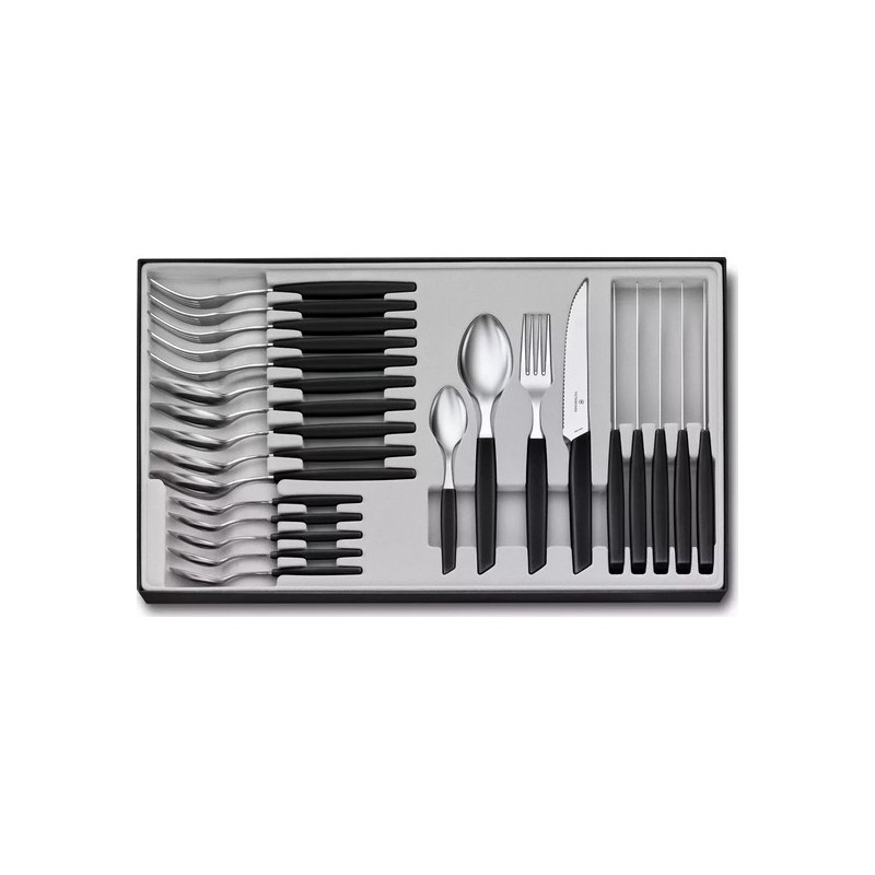Ménagère 24 pièces Swiss Modern en acier inox 18/10, manche polypropylène noir, comprenant : - 6 couteaux steak lame crantée 12 cm (Réf. 6.9003.12W). - 6 fourchettes. - 6 cuillers à soupe. - 6 cuillers à café.