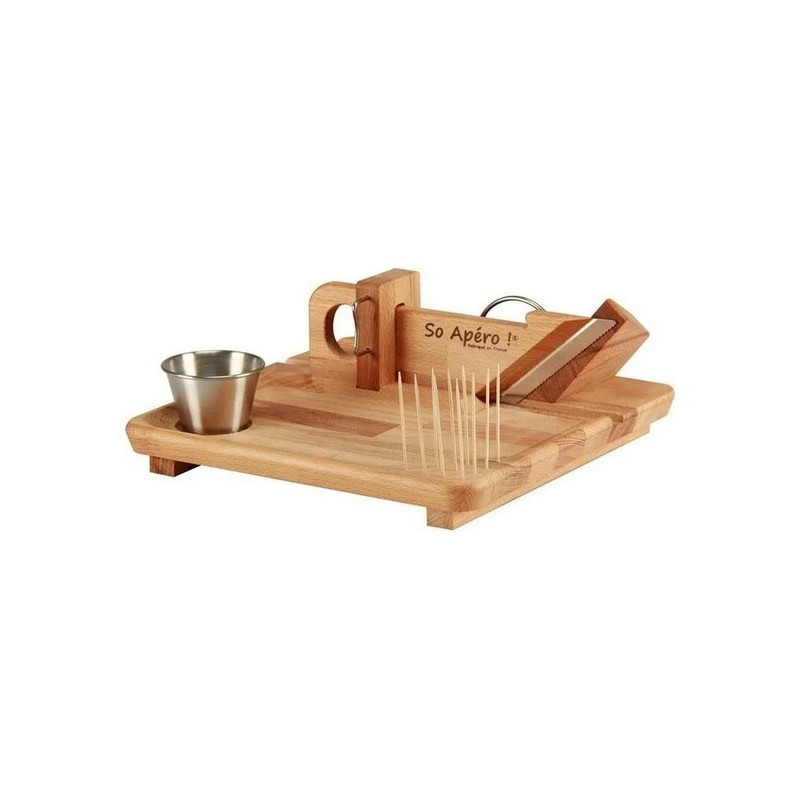 Guillotine à saucisson avec plateau. Hauteur de coupe : 63 mm. Adaptée à la coupe d'autres produits alimentaires compatibles avec la taille de la lame à dents inox. Le plateau permet la présentation des différents produits tranchés avec la guillotine. Livrée avec ramequin 6 cl inox et piques en bois. Dimensions: 28 x 28 x 12 cm.