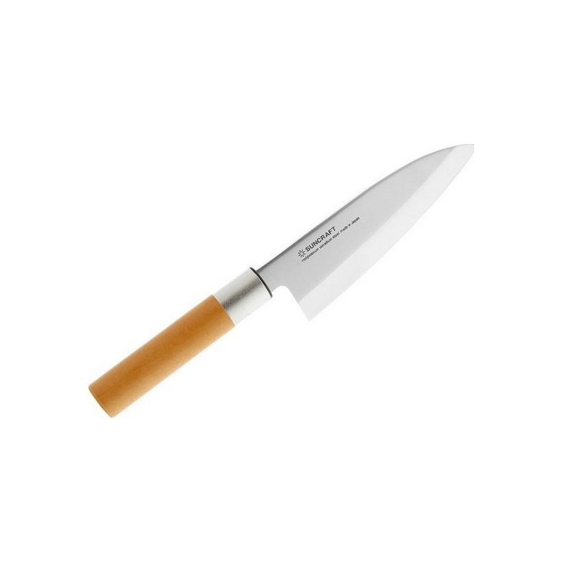 Lame 17 cm. Modèle tous usages convenant spécialement pour la découpe du poisson. Les couteaux de la série Senzo Wa sont équipés de lame en acier 1K6 avec une dureté Rockwell de 58 +/- 1. Le manche est en bois de magnolia et la mitre en acier inoxydable. Ce couteau ne va pas au lave-vaisselle.