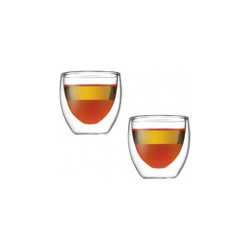 2 verres transparents, double paroi (maintien le chaud ou le froid), 8 cl. Passe au four (180 degrés maxi) et au lave-vaisselle. Pour expresso, verrines, etc..