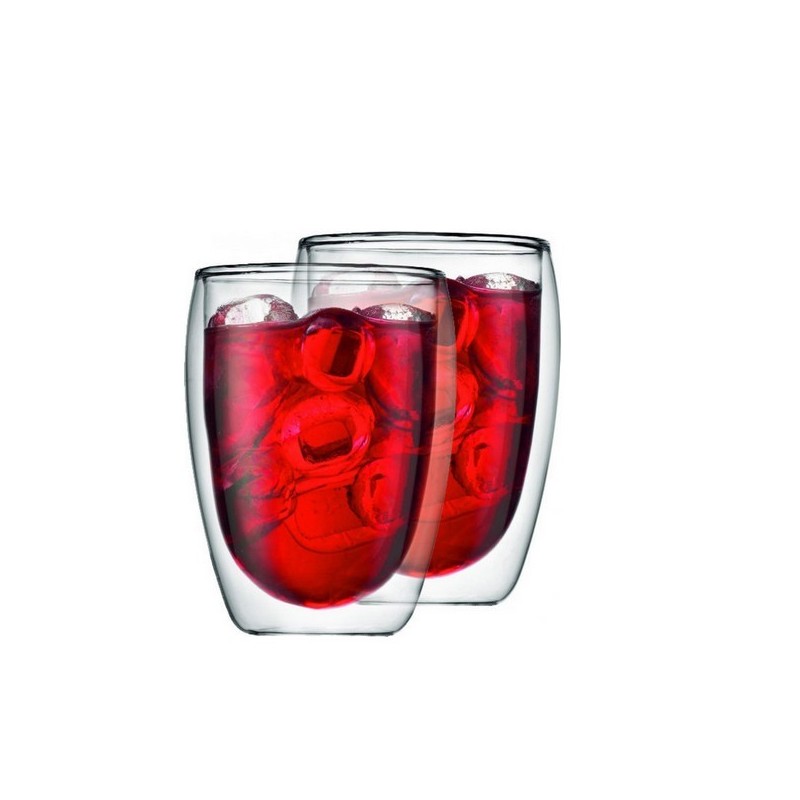 2 verres transparents, double paroi (maintien le chaud ou le froid), 35 cl. Passe au four (180 degrés maxi) et au lave-vaisselle. Pour expresso, verrines, etc…