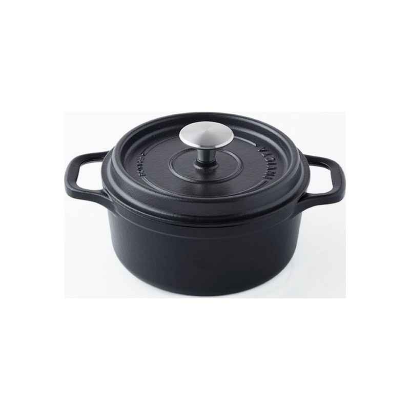 Cocotte ronde de 24 cm. capacité : 4 l. fonte émaillée noire. avec poignées. Couvercle à réserve d'eau et à picots intérieurs pour assurer un arrosage homogène et continu. avec poignée/bouton inox. Compatible tout feux et four. passe au lave-vaisselle.