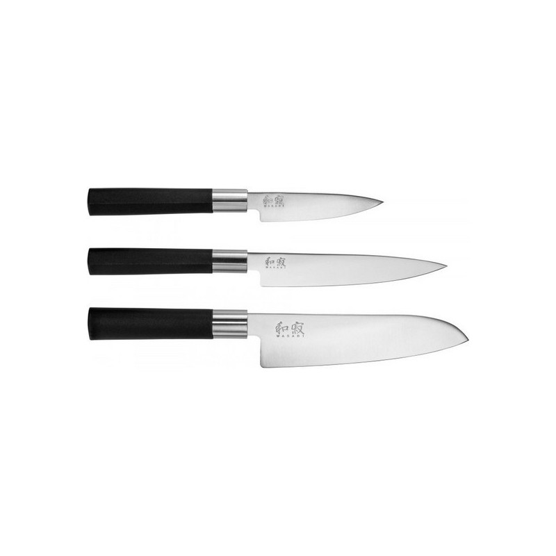 Coffret comprend: 3 couteaux Wasabi black: un universel 10 cm et 15 cm . un santoku 16.5 cm. Lame en acier inox poli avec une dureté Rockwell de 58 +/- 1. Le manche offre une hygiène optimale grâce à son mélange de poudre de bambou (anti-bactérien naturel) et de polypropylène. Manche noir enclavé. complètement la lame qui est ainsi inamovible. Ceci empêche les saletés de s'y déposer. Ne va pas au lave-vaisselle.