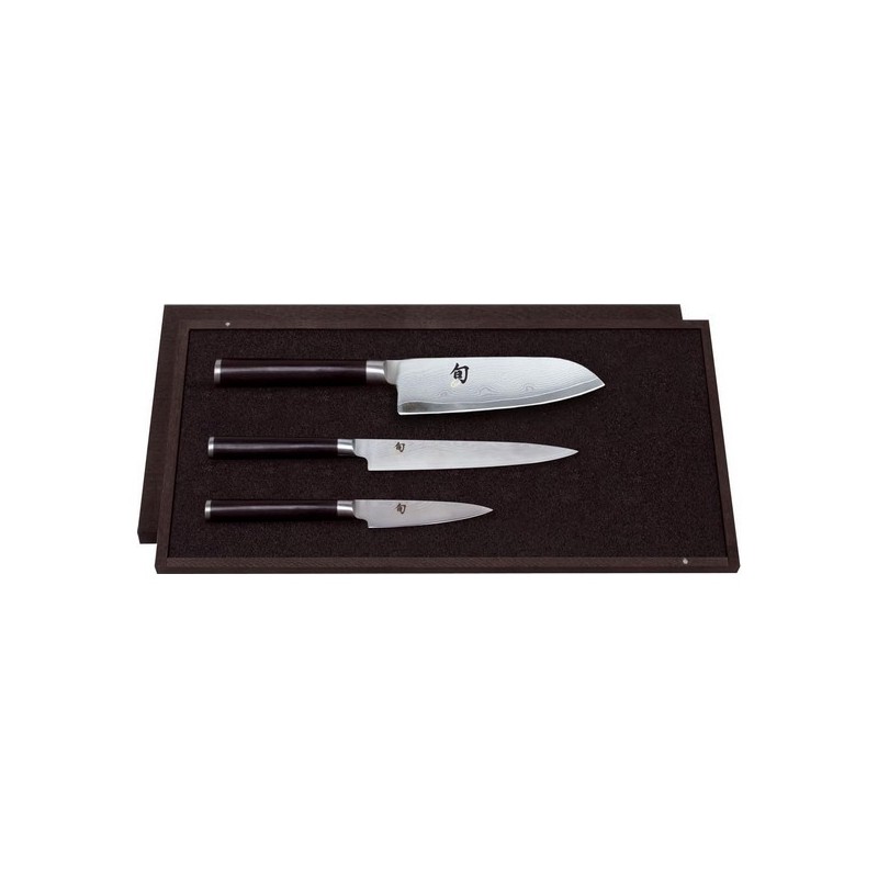 Set 3 couteaux Shun Classic. coffret bois. Ne va pas au lave-vaisselle. La série Shun Classic remporte un large succès auprès des cuisiniers les plus exigeants. Les couteaux professionnels Shun sont fabriqués en acier damas inox composé de 32 couches et d'un noyau central en acier VG-10. Cet acier très dur. particulièrement résistant à la corrosion. possède une dureté Rockwell de 61 +/- 1. Le tranchant convexe de la lame ainsi que l'affûtage manuel de chaque couteau Shun garantissent une coupe remarquable. La beauté du manche. en lamelles de pakka compressé. est rehaussée par une mitre en bout.