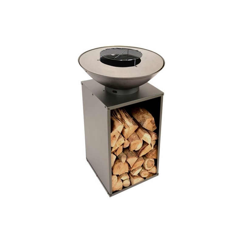 Braséro de cuisson avec réserve bois + Housse protection + Grille surélevée. Anneau de cuisson diamètre 59,5cm – Epaisseur 4 mm en acier. Cuve Braséro : h17 x diam60 cm – Epaisseur 1,8 mm. Base: 46 x 44 x h65 cm – Epaisseur 1,8 mm.