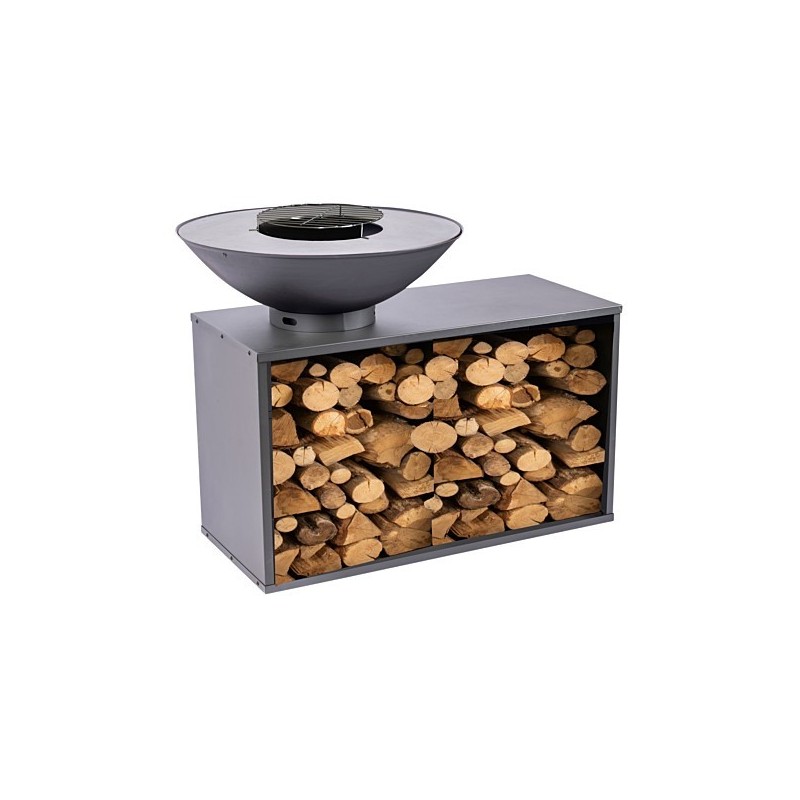 Braséro de cuisson avec réserve bois + Housse protection + Grille. Anneau de cuisson diamêtre 79,5cm - Epaisseur 4 mm en acier Cuve. Braséro : h23 x diam 80 cm – Epaisseur 1,8 mm. Base: 115 x 51 x h68cm – Epaisseur 1,8 mm. Dimensions : 115 x 80 x h91.