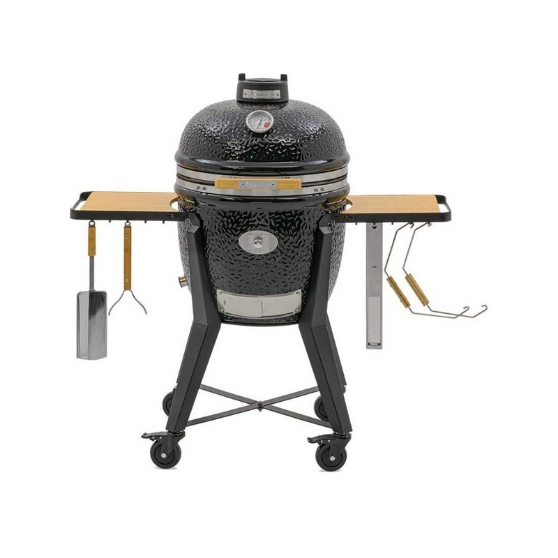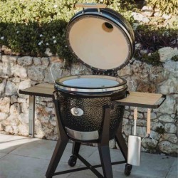 Idéal pour cuisiner pour plus de 10 personnes, diamètre de cuisson 55 cm. Trappe de fumage intégrée pour ajouter pellets et copeaux aromatiques sans interrompre la cuisson. Température réglable entre 90 et 400 degrés C. Livré avec chariot, tablettes et housse. Céramique très épaisse et durable, pièces métalliques en inox 304 alimentaire. Pièces métalliques inoxydables. Accessoires inclus : pelle à cendres, lève grille, tiroir de fumage etc. Possibilité de cuisiner sur 2 zones séparées et sur 3 étages grâce aux équipements inclus : 2 demi grilles en inox, 2 déflecteurs demi lune, 2 demi bacs d'égouttage. Dimensions : 135 x 80 x 129 cm.