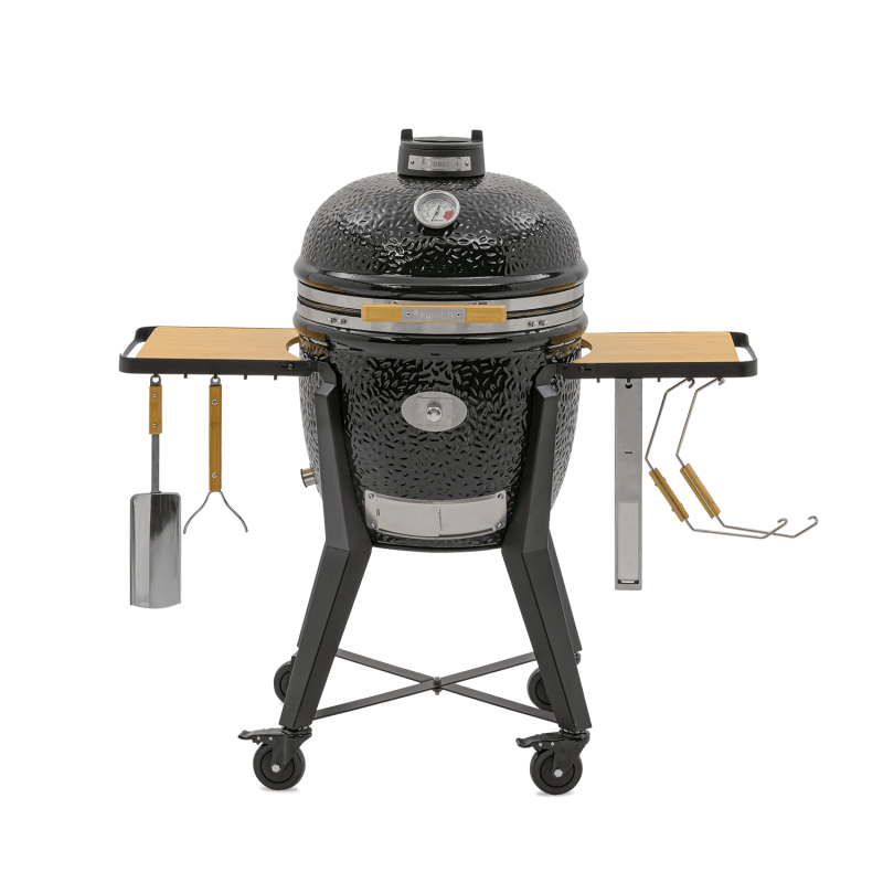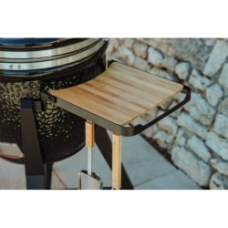 Barbecue kamado en céramique. Énergie : charbon de bois. Diamètre de cuisson : environ 52 cm. Capacité : environ 8 à 12 personnes. Matériau cuve / couvercle : céramique haute qualité. Grilles en acier inoxydable. Chariot : acier avec roulettes. Tablettes : 2 tablettes latérales rabattables. Thermomètre intégré. Modes de cuisson : directe, indirecte, fumage, four/pizza (avec accessoires). Accessoires inclus : housse de protection, pierre à pizza Dimensions : environ 129 × 80 × 135 cm.