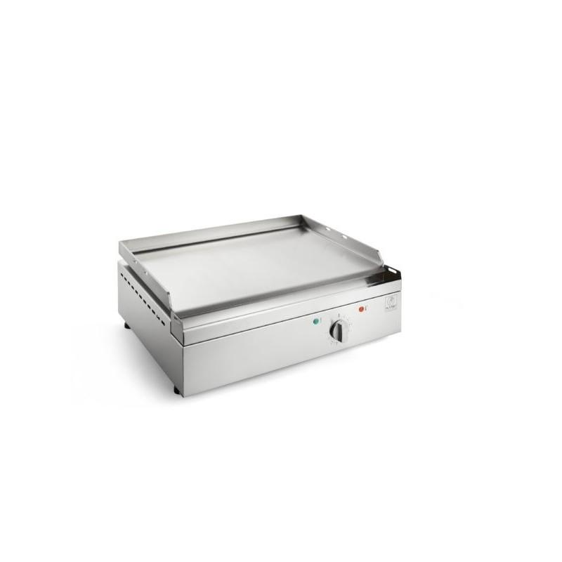 Plancha électrique pour cuisson intérieure / extérieure. Puissance : 2080 W. Plaque de cuisson : 53 × 40 cm, épaisseur 5 mm. Surface : plaque lisse. Bac à graisse : intégré et incliné. Pieds : réglables en hauteur. Caisson : isolé pour sécurité et performance thermique. Dimensions : 540 × 500 × 200 mm.