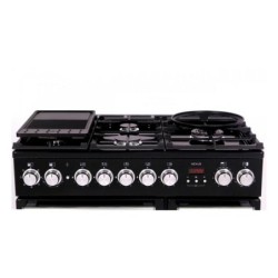Gaz 90cm : 5 brûleurs (dont un brûleur multi couronne), une grille plancha antiadhésive, un support wok.