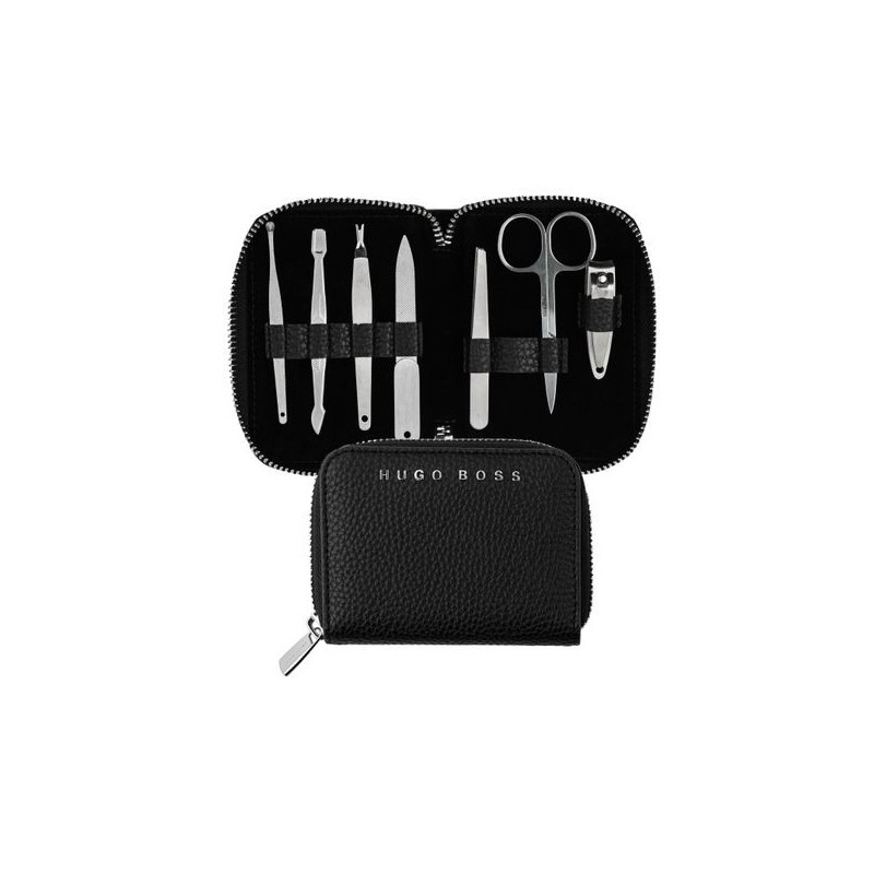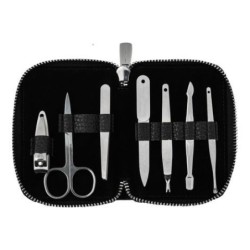 Set d'outils de soin en acier brossé: lime à ongles, ciseaux, pince à épiler, coupe-ongles, nettoyant oreilles, repousse cuticules et fourchette de peaux. Trousse en polyuréthan, finition chrome. Dimensions: 11 x 8,5 x 2 cm, idéal pour voyager.