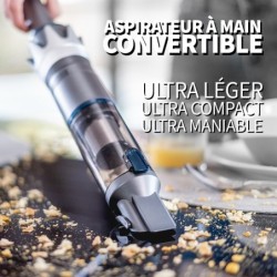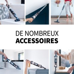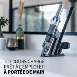 Surfaces compatibles: sols, meubles, fauteuils, intérieurs de voitures... Puissance: 120 Watt. Batterie: 2600 mAH. Modes: 2 vitesses. Type de recharge: station de charge à poser. Contenance du collecteur à poussière: 0.1 L. Temps de chargement: 5 h. Autonomie: 22 min. Dimensions : 11 x 67 x 20 cm.