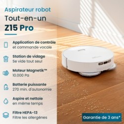 Navigation Intelligente et Évitement d'Obstacles. Fonctionnalités All-in-One: En plus de l'aspiration, il peut balayer les surfaces et même laver les sols. Cartographie Intelligente pour une Navigation Optimal. Mode de nettoyage intelligent sur tout type de sols. Nettoyage des zones basses. Séchage automatique de la lingette. Gestion de la poussière automatique: La base de chargement aspirant le bac à poussière représente une innovation pratique dans les robots aspirateurs. Capacitéé de la batterie: 5000 Mah. Temps de charge: 7 h. Contenance du sac à poussière: 1.8 L. Contenance du bac à eaux propres: 2.5 L. Autonomie: 270 min. Vendu sans le téléphone.