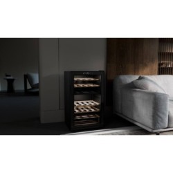 Cave à vin de service double zone 33 bouteilles. 2 zones (Zone sup : 5-20degré(s)C/15btles + Zone inf: 5-20degré(s)C/18btles). Contrôle électronique. 4 clayettes bois de hêtre, porte vitrée, pieds ajustables, éclairage intérieur LED, 36dB. Classe énergie G. Dimensions : 49,5 x 43 x 84,8 cm. Cave livrée sans bouteilles. L'abus d'alcool est dangereux pour la santé, à consommer avec modération. Livraison RDC / Pas de porte.