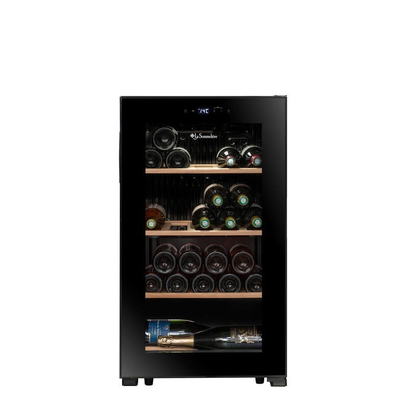 Equipements : Hygrométrie régulée. thermostat électronique en façade, porte vitrée, encadrement inox, 4 clayettes en bois, éclairage intérieur LED. Panneau de contrôle intégré à la porte : plus besoin d'ouvrir la porte pour effectuer les réglages de la cave. Plage de température intérieure (+5 à +20degré(s) C). Niveau sonore 37 dB. Dimensions : L48 x P43 x H83.8 cm. Cave livrée sans bouteilles. L'abus d'alcool est dangereux pour la santé, à consommer avec modération. Livraison RDC / Pas de porte.