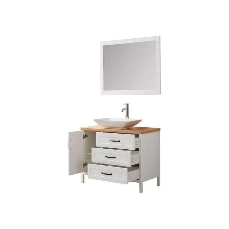 Apportez de la luminosité et de la pureté à votre pièce d'eau avec cet ensemble de salle de bain blanc composé d'un meuble de salle de bain, d'un miroir et d'une vasque à poser. Equipé d'une porte et de 3 tiroirs, vous pourrez ranger facilement tous vos produits de toilette Matière meuble: MDF (panneau de fibres de bois) Dimensions: 100 x 46 x 75 cm. Les portes possèdent un système d'amortissement à la fermeture. Miroir: un crochet à l'arrière ne peut être accroché que dans un sens, dimensions: 100 x 75 cm. Vasque en porcelaine, blanc- Longueur : 58 cm x 10 cm.