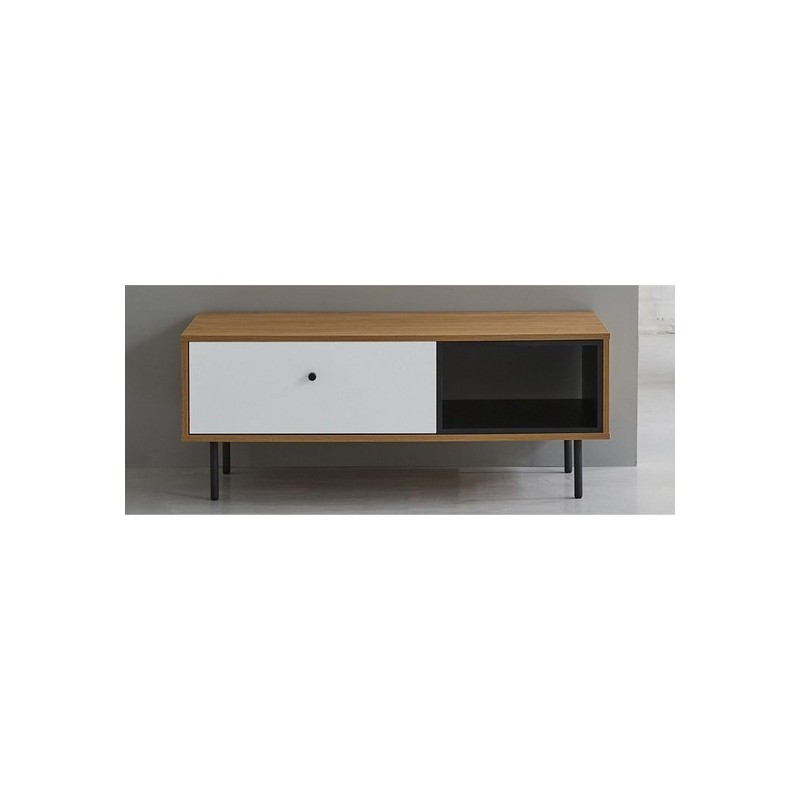 Avec ses couleurs épurées naturel, blanc et noir, cette table basse trouvera facilement sa place dans tous les types de salons. Composée d'une niche ouverte et d'un tiroir, elle allie fonctionnalité et modernité. Doté d'un tiroir, d'une niche ouverte et d'un placard, il est pratique et tendance. Matières : MDF (panneau de fibres de bois) et pieds en métal peint, dimensions: 100x 40 x 50 cm. Dimensions tiroir (L,P,H) : 51,2 x 28,4 x 13,3 cm. Poids maxi supporté : 60 kg.