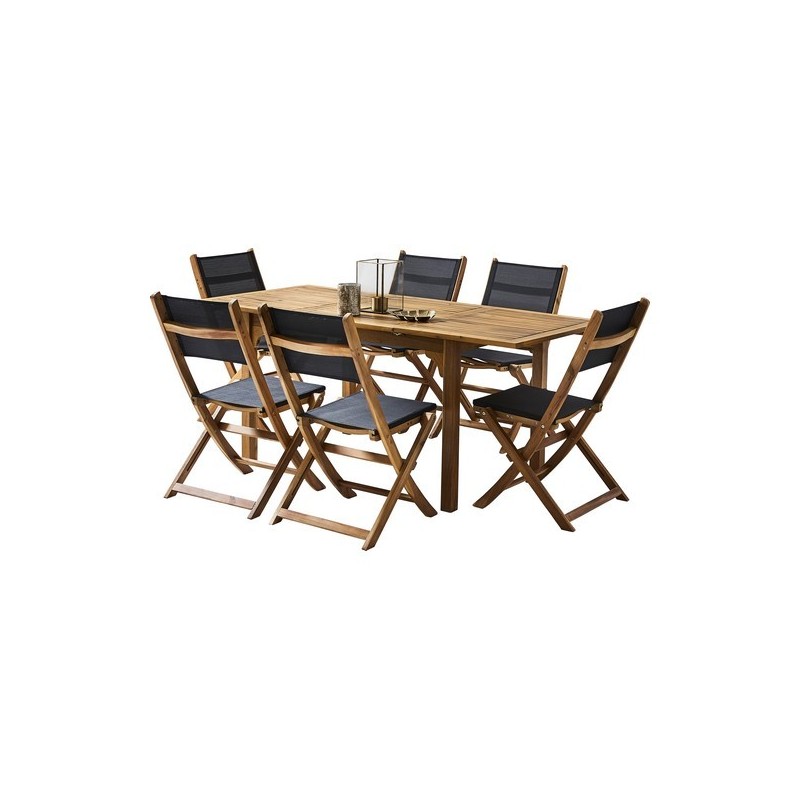 Ensemble rectangulaire extensible en acacia 6/8 pers avec 6 chaises en textilène. Peut accueillir 8 personnes. Dimensions/ ouverte: ouvert 180x90x75/ 120 cm. Vendu sans les couverts.