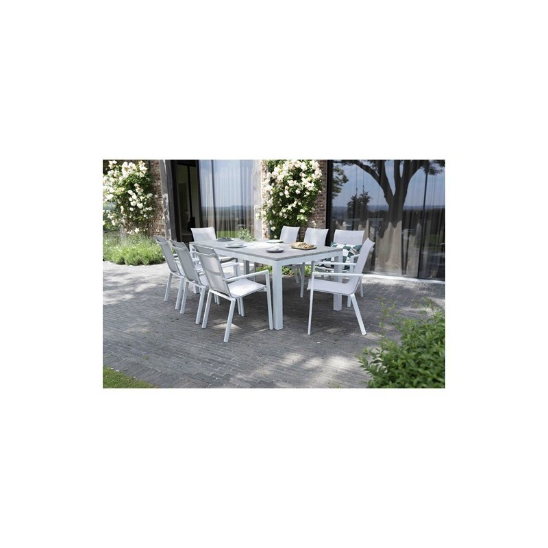 Composants : 1 table fixe pour 8 personnes en aluminium blanc avec plateau en aluminium décor bois, 8 fauteuils en aluminium avec assise grise. Design : Concept contemporain avec lignes épurées. Confort : Confort étudié pour un usage agréable. Dimensions table : 100 x 200 x 76. Dimensions fauteuil : 87 x 57 x 61 cm. Vendu sans les couverts et décorations.