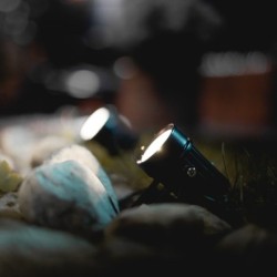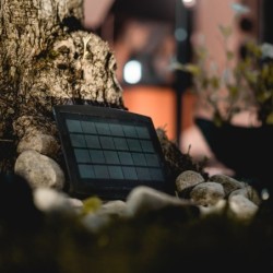 Détecteur de luminosité. Waterproof IP65. Revêtement en plastic ABS. Batterie de 2000 mAh. 150 lumens par lampe. Temps de charge de 6h. Autonomie de 12h. Panneau solaire déporté rattaché aux lampes.