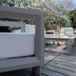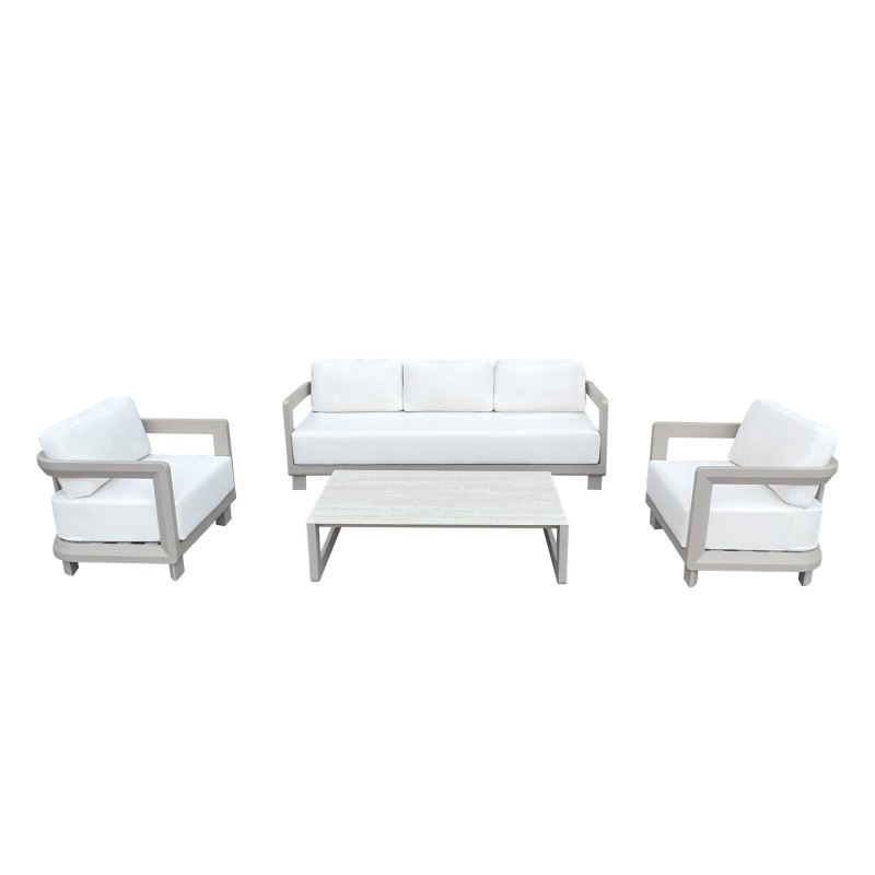 Structure en aluminium taupe (robuste et légère). Canapé 3 places – 212 cm. 2 fauteuils individuels – 76 cm chacun. Table basse – 125 cm. Plateau en pierre finition ivoire. Coussins en tissu crème, faciles d’entretien.